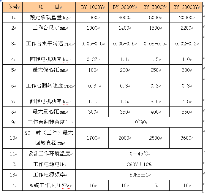 为提高翻转力矩,同时考虑翻转的抗振动和冲击韧性,我公司专门为用户设计用液压翻转变位机,变位机采用座式结构,主要由机架、回转机构、液压翻转机构、导电装置、电气控制系统(用户自备)等部分组成。工作台回转采用交流变频无级调速,转速均匀,无爬行,保证满足焊接工件对回转速度的要求。结构设计合理,具有良好的抗弯、抗扭能力.
